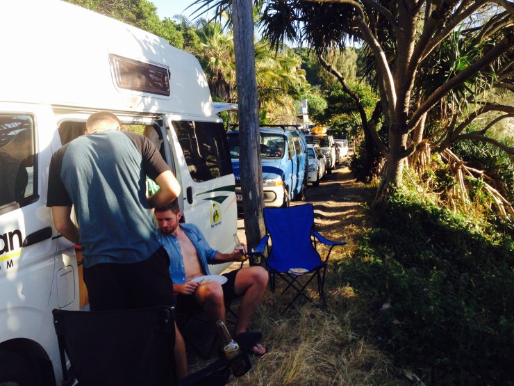 Nach der etwas schwierigen Suche nach einem kostenlosen Platz zum Campen (es stehen nämlich überall Schilder, dass das verboten ist) haben wir uns einfach mitten in die Innenstadt in eine dunkle Gasse gestellt. Wie sich rausgestellt hat direkt vor ein Hostel – etwas dreist. Deshalb sind wir schnell feiern gegangen. Byron Bay hat den Ruf ein kleines „Hippie-Paradies“ zu sein, was man dann teilweise auch gemerkt hat. Die Musik war sehr gut und die Leute waren entspannt drauf, es gibt aber auch regeln, z.B. dass Shots verboten sind. Am Ende waren wir froh, dass wir einen kurzen Weg von knapp 1 Minute zu unserem Schlafplatz fast vor dem Club hatten, aber nicht so froh dass wir keine Toilette hatten.