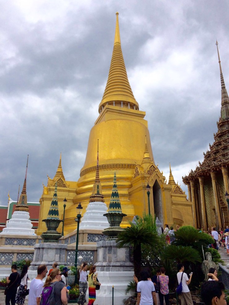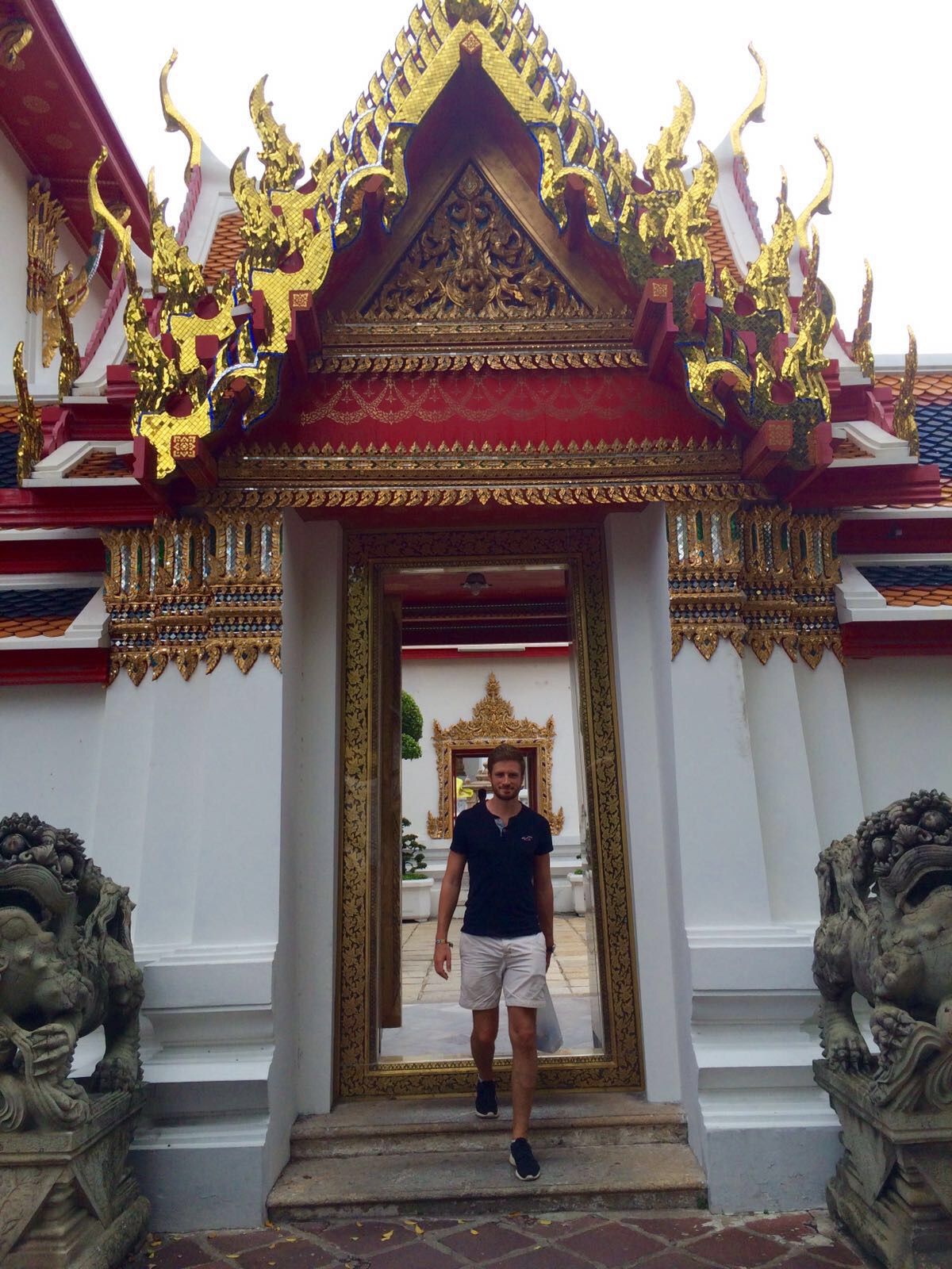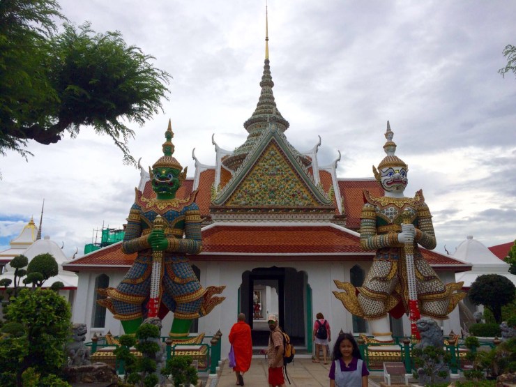 Nach einem kurzen Flug von nicht mal 2,5 Stunden kamen wir nachmittags in Bangkok an. Von dort aus sind wir mit dem Bus und der U-Bahn zu unserem Hostel Sribumpen gefahren. Als wir allerdings aus der U-Bahn Station rauskamen erwartete uns erstmal Regen. Wir dachten der Schauer geht schnell vorüber und warteten deshalb zunächst. Irgendwann wurden wir aber ungeduldig und dachten, dass es nicht so schlimm sei etwas nass zu werden und gingen deshalb los. Allerdings haben wir den Regen komplett unterschätzt und nach dem kurzen Weg zum Hostel waren wir bis auf die Unterwäsche durchnässt. Ein Fehler den wir nicht noch einmal machen wollen, der aber trotzdem ganz lustig war. Das Hostel war eigentlich ganz schön, alles da was man braucht. Wegen des Regens sind wir dann auch nur noch zu einem nahegelegenen Restaurant gegangen. Am nächsten morgen regnete es zum Glück nicht mehr und wir gönnten uns erstmal ein richtiges Frühstück – endlich wieder. Danach fuhren wir in die Innenstadt. Die Stadt erschlägt einen erstmal etwas, da sie wirklich sehr unübersichtlich ist und eine schlechte Infrastruktur hat. Wir wanderten erstmal etwas durch Chinatown – das gibt’s hier anscheinend in jedem Land – und erspähten die ersten Tempel.