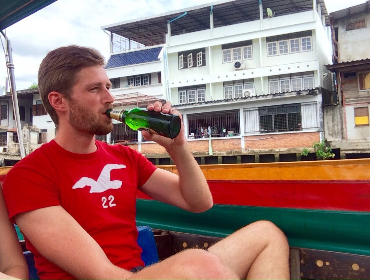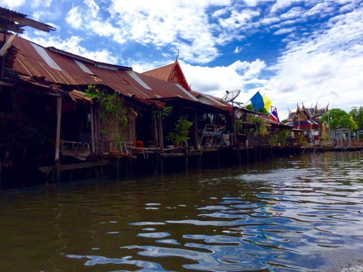 Unser letztes Must-Do für Bangkok war eine Bootsfahrt mit einem Langschwanzboot über die Flüsse. Gleich anschließend konnten wir so eine Fahrt eine Stunde lang genießen. Wir fuhren über den großen Fluss und durch kleine Kanäle und kamen vorbei an vielen ärmlichen Häusern auf Stelzen, leider auch viel Müll, großen Varanen und mal wieder an Tempeln. Außerdem gab es hier einen kleinen Floating Market, bei dem ein paar Boote direkt auf dem Wasser Verschiedenstes verkauften, z.B. hatte Christoph so das Glück ein Bier zu bekommen.