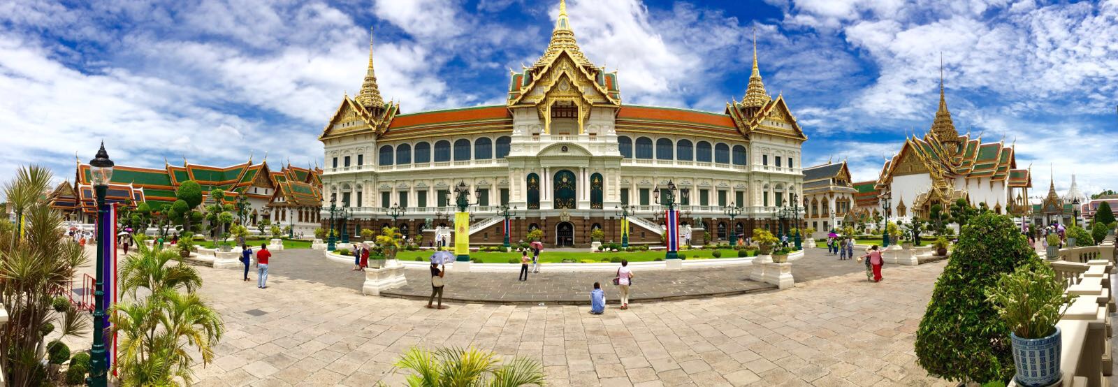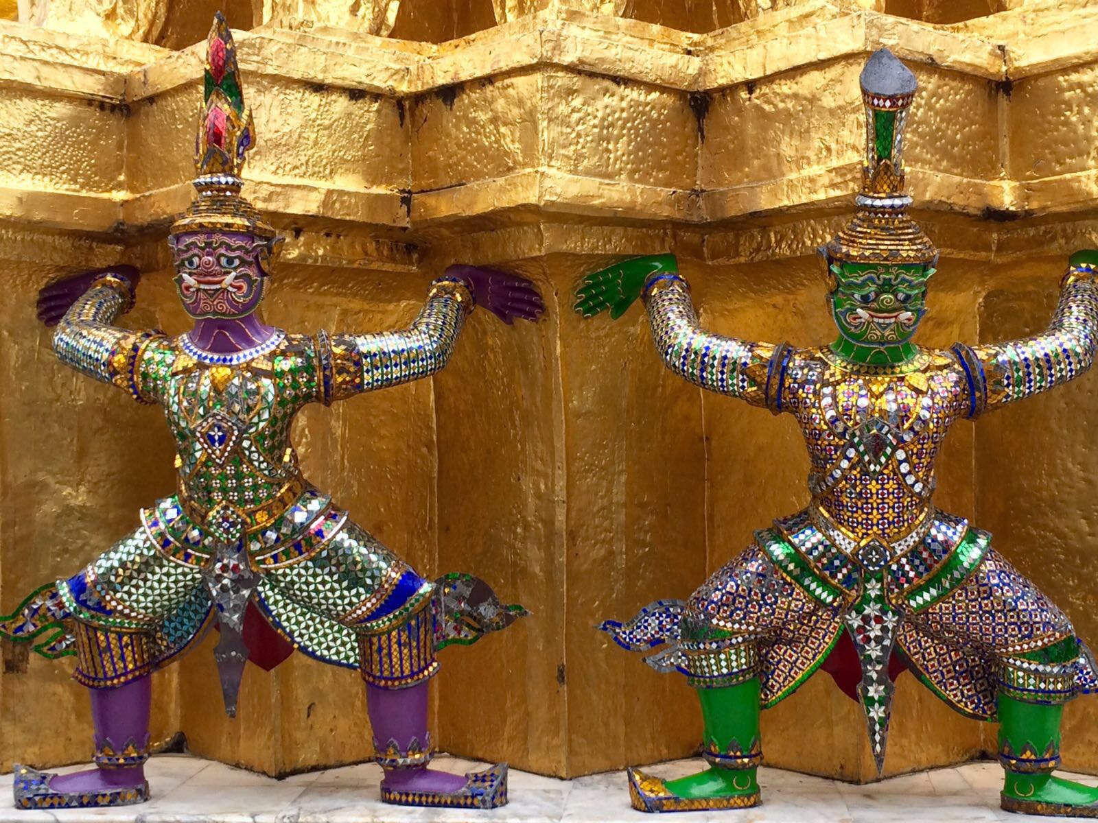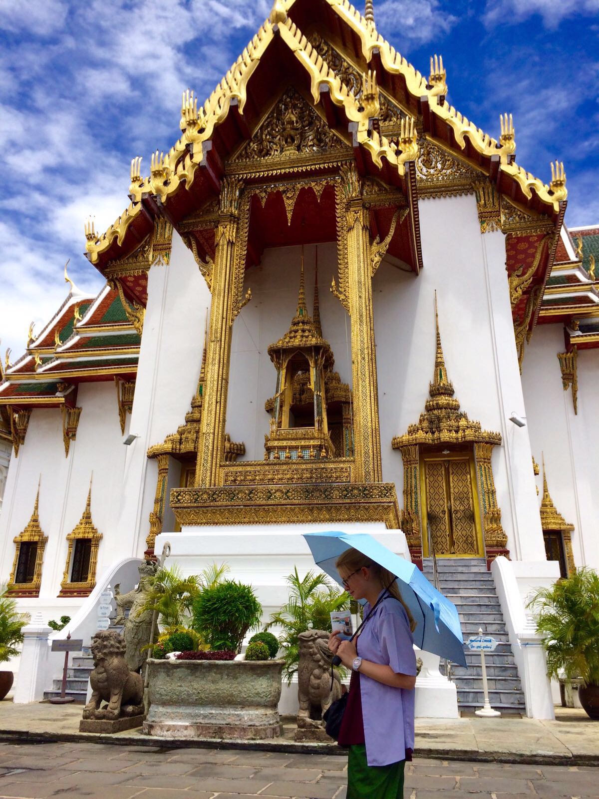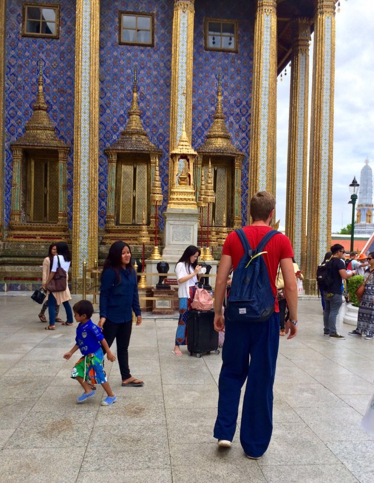 Danach fuhren wir dann zum Königspalast, der als absolutes Highlight jeder Thailand Reise angepriesen wird. Deshalb nahmen wir auch den hohen Eintrittspreis und die strengen Regeln in Kauf. Hier durfte kein Millimeter Haut zu viel gezeigt werden, weshalb wir uns Klamotten leihen mussten. Am Ende sah ich mit einem langen Rock und ärmelloser Bluse aus wie eine Putzfrau und wir beide hatten echte Probleme mit so vielen Klamottenschichten bei fast 40 Grad!